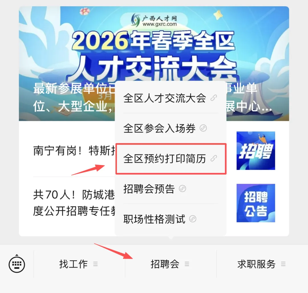 在广西人才网公众号底部的【招聘会】菜单栏中找到【全区预约打印简历】子菜单,即可预约打印简历。