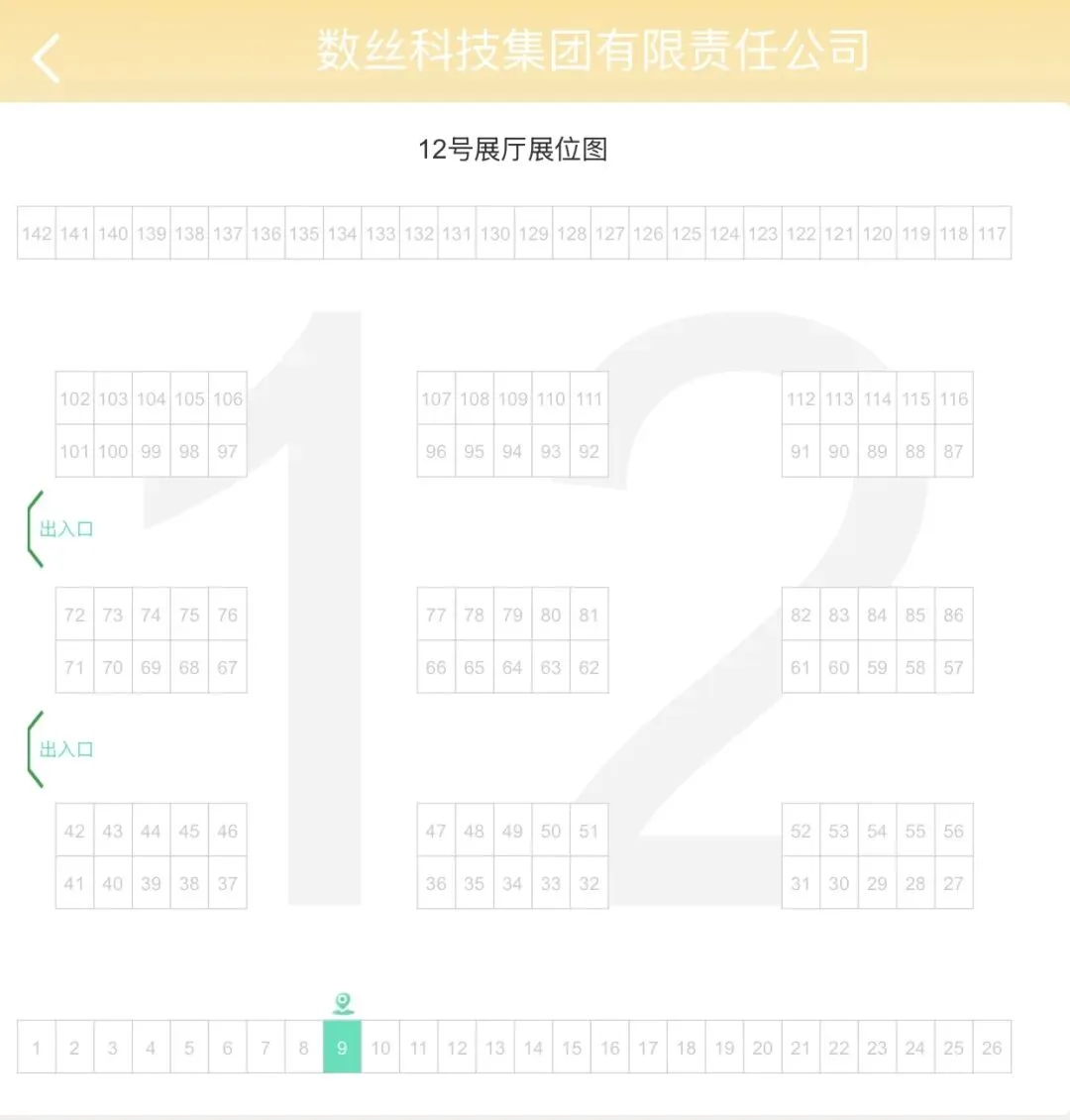 企业右上角的方框中显示的是企业的展厅位置,例如上图企业的展厅位置在:12号展厅9号展位,点击即可查看该展厅展位图。