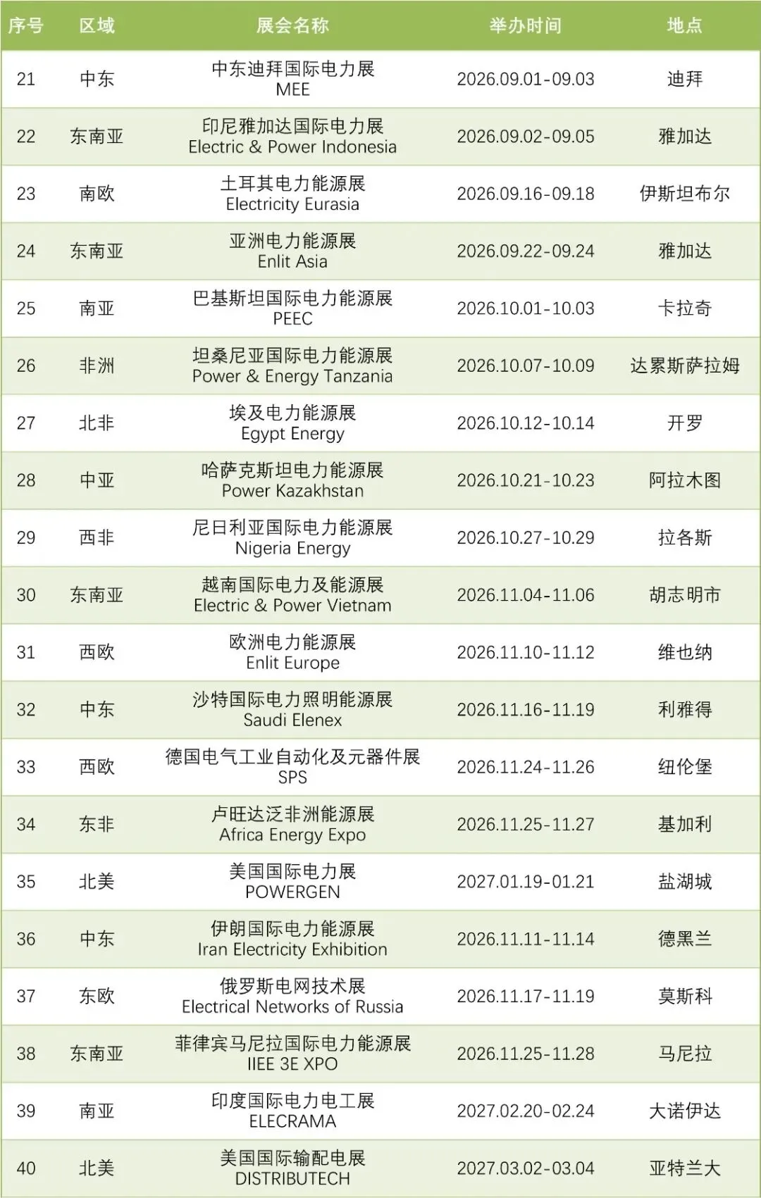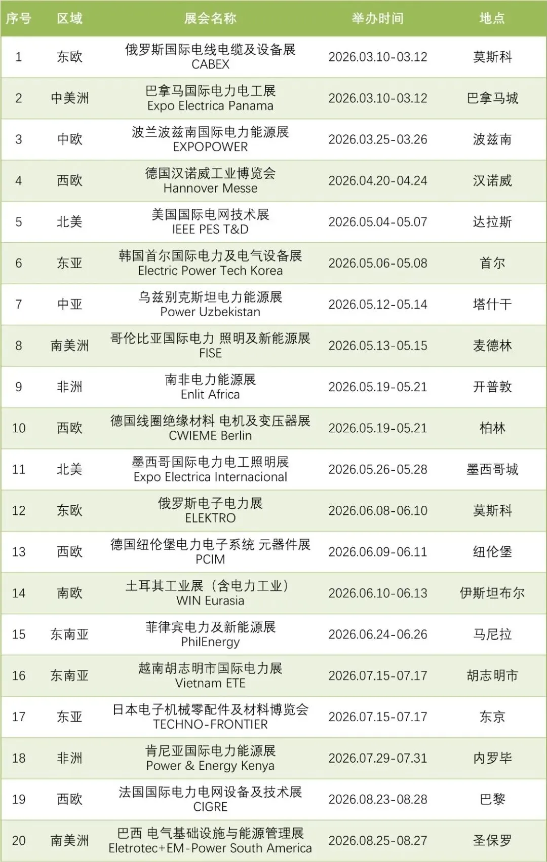 我们整理了一份 2026年全球电力电工行业主要展会时间表,涵盖电网、电力设备、电气自动化、电缆、输配电及电力能源相关展会,供企业规划海外市场与参展安排参考。