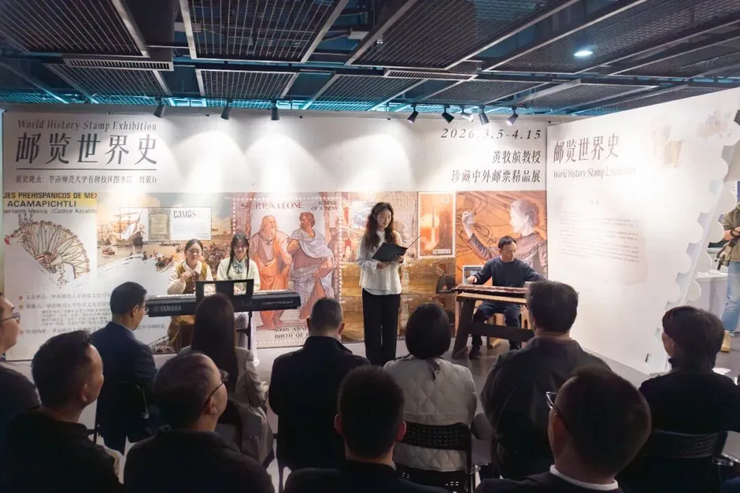 3月5日上午,“邮览世界史——黄牧航教授珍藏中外邮票精品展”在华师石牌校园图书馆一楼展厅正式开幕。开幕式以“文明互鉴·诗乐和鸣”为主题,现场举行了古琴、电钢琴演奏以及诗歌朗诵。历史文化学院院长刘晓东致辞,肯定了展览在创新历史教学与推动美育实践方面的积极意义。黄牧航教授讲述了邮票收藏的历程,分享了借助邮票资源开展教育教学工作的故事。党委宣传部、党委学生工作部、离退休工作处、校团委、图书馆、校史文博馆、法学院等单位负责人,历史文化学院党政领导、师生代表及校外导师、校友等参加开幕式。
