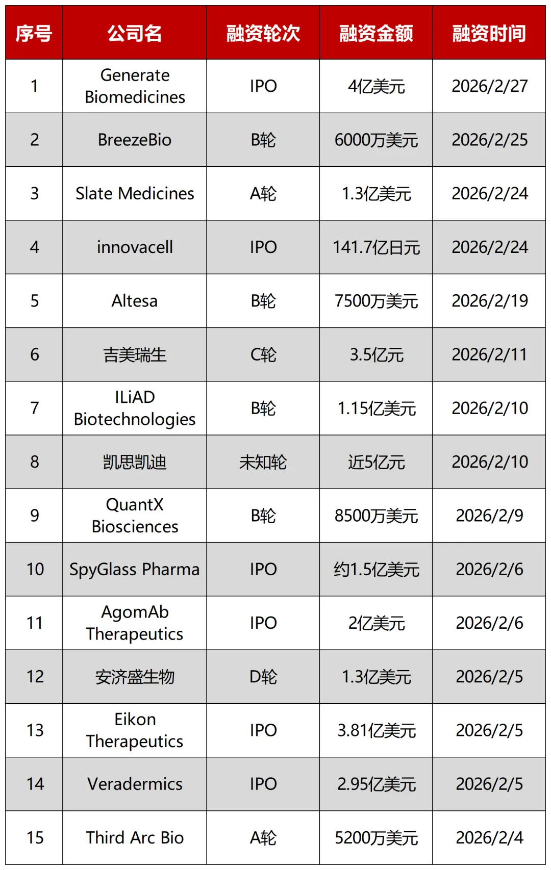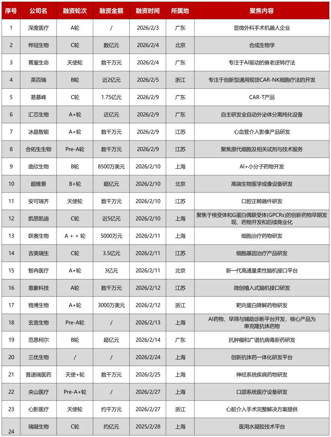 据不完全统计,2026年2月全国生物医药企业融资事件24起,过亿元融资的企业有12家,总金额估计达30亿人民币以上。