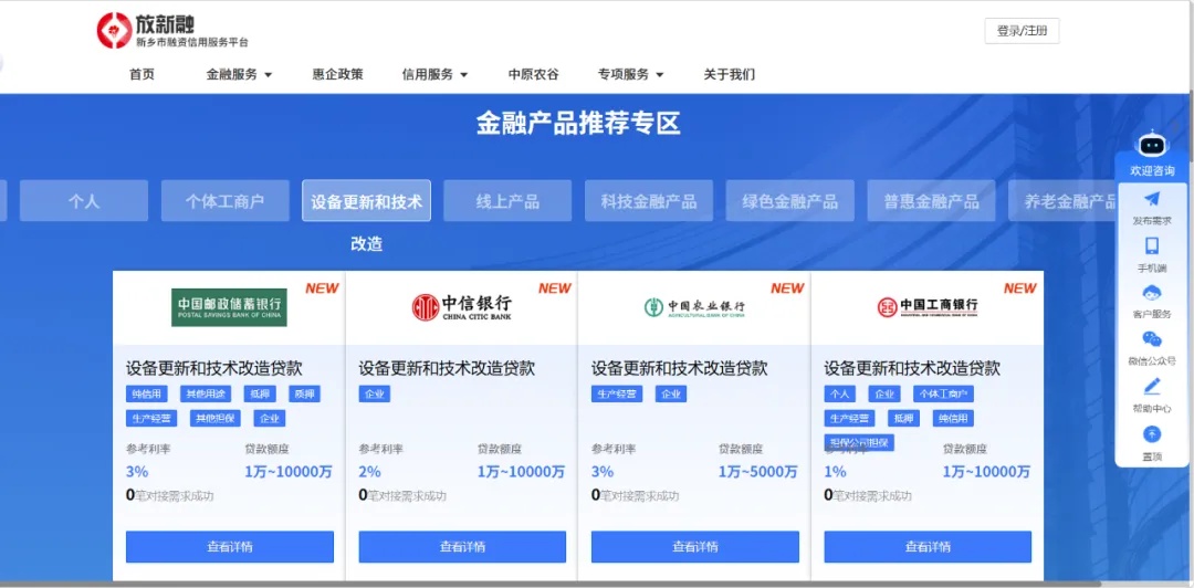 筛选产品:在银行列表中查找筛选带有“设备更新”“技术改造”标签的专属产品