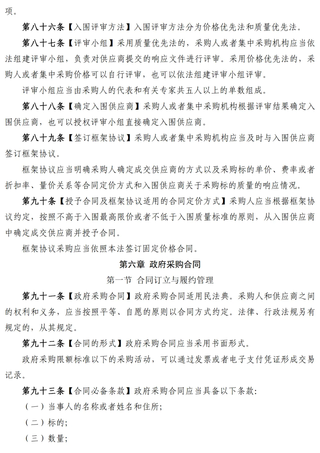此外,第八十七条,在组建评审小组进行评审方面,采用质量优先法的,采购人或者集中采购机构应当依法组建评审小组,负责对供应商提交的响应文件进行评审。采用价格优先法的,采购人或者集中采购价格可以自行评审,也可以依法组建评审小组评审。评审小组应当由采购人的代表和有关专家共五人以上的单数组成。下面,一起来看看本次中华人民共和国政府采购法(修订草案征求意见稿)的具体内容。编辑:梓姬