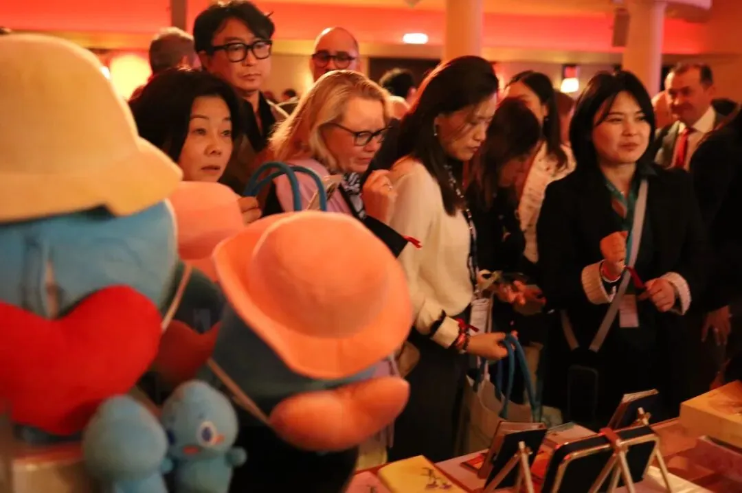 在“中国之夜”活动现场,湖北展区同样成为人气焦点。省级非遗汉绣传承人现场展示刺绣技艺,茶艺师以长江水冲泡湖北名茶,茶香氤氲中吸引各国嘉宾驻足品鉴。融合AI科技的长江礼物“豚宝”以智能交互形式讲述长江故事,扬子江樱花饼、湖北地标曲奇等特色产品也吸引众多嘉宾体验。四大体验区贯穿整场活动,让嘉宾在指尖、舌尖与心间深度感知“知音湖北”的文化厚度。
