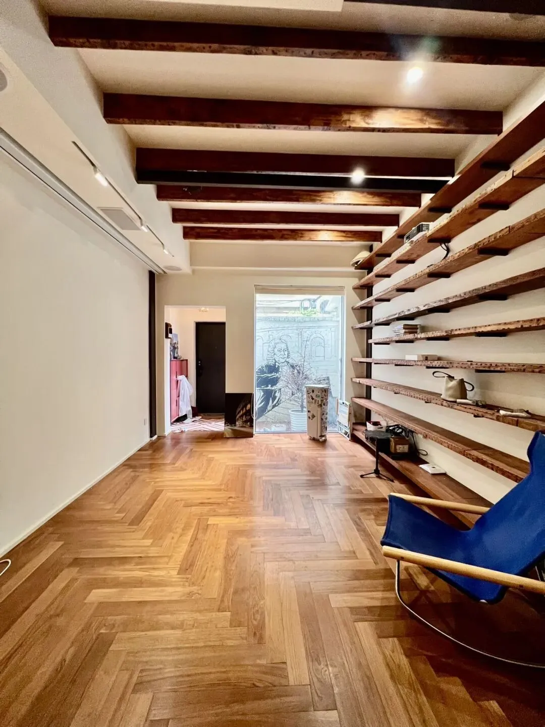 一楼客厅一改常规的沙发、茶几摆设,房东设置了整面的书柜,不仅增加了收纳空间而且大大的提升了生活的品质。