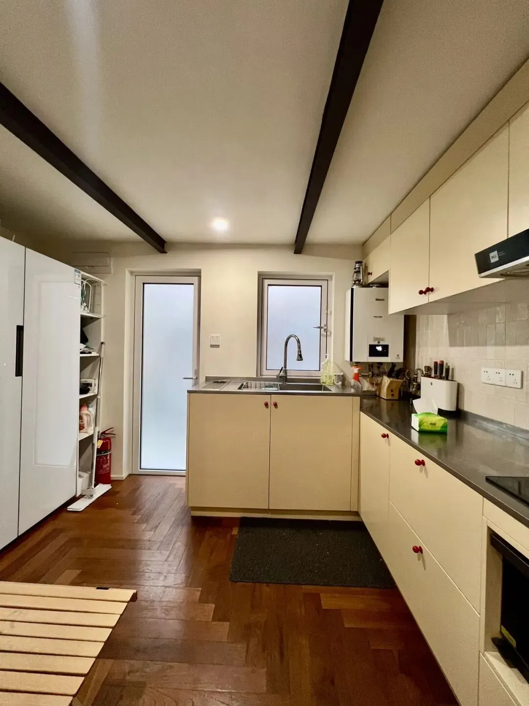 厨房在北侧做的是半开放式的,北面还有后门可以进出。
