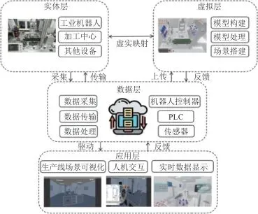 数字孪生本质上是一种双向的虚实映射,通过孪生数据对物理实体和虚拟模型实现双向驱动,建立通信系统,将实体生产线与虚拟生产线相连接,利用虚实交互技术,设计面向实际生产的数字孪生可视化系统,对工业制造与生产管控的信息智能化提供一定帮助。 本文以盘类零件加工生产线为对象,应用数字孪生技术设计了一条孪生线,此孪生线由仓储库、输送带、变位机和加工中心等单元组成,为使生产线结构紧凑,采取U字型生产线结构,中枢为机器人,能够完成零件的加工、装配、入库。在可视化系统中,实现生产线与数据的可视化、营造沉浸式场景时,需要保证模型的质量,为了提高可视化效果[8],在构建虚拟场景时需要从不同的角度出发,完成模型的优化、生产线的布局、场景的转换,最终搭建出趋近于真实渲染的可视化场景,进一步完成数据的可视化效果。本文提出的产品装配线数字孪生可视化系统框架由实体层、虚拟层、数据层、应用层四部分组成,如图1所示。
