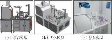 图2孪生体构建流程对于创建好的加工生产线模型,经过STEP格式转换,可导入3ds Max中进行模型优化处理,优化后的模型再经FBX格式转换,导入Unity3D中进行可视化场景搭建。在3ds Max中利用高质量的渲染引擎对模型进行优化处理,包括对模型进行材质和贴图处理,根据实体设备的材质属性对创建好的模型增添材质,增强模型的可视化效果,导入到3ds Max中的模型多边形数量庞大,应有效降低模型多边形数量,因此对网格模型进行简化操作,轻量化处理后的模型仍可以满足实时交互、实时更新的要求,模型能够快速显示且运行更加流畅。 创建好的模型只是单一的生产线模型,不具有空间属性,需为模型添加空间场景。其目的是加强生产线运行过程的真实性,使模型不仅能在数据的驱动下运行,还能在趋近于真实的沉浸式场景中符合现实规律运行。模型对比如图3所示。