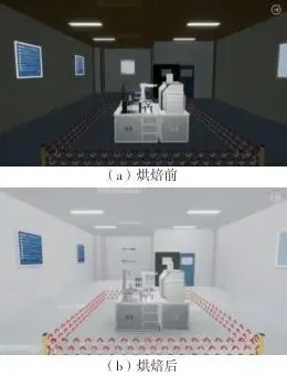 图3模型对比使用UG NX模拟生产线运行过程时模型的数据透明化程度较低,对上述模型优化处理操作后将模型导入Unity3D中,通过对比发现,在Unity3D中搭建好场景后的虚拟空间更加真实,在场景中可以对交互功能进行研究与设计。 Unity3D可以使模型和数据可视化,提供沉浸式的用户体验和实时的监控分析。通过这种整合,能够在数字环境中进行真实的生产线场景可视化。单一模型不利于构建可视化系统,所以在Unity3D中需要进行场景搭建,通过格式转换将模型导入搭建的场景中,展现真实的生产线设备运行状态。在Unity3D中搭建的空间虚拟场景不具有实体层的属性,为了提升场景的真实感和视觉效果,以营造沉浸式场景,在车间中根据场景布置、调整光源,以区域光源搭配点光源照亮场景,确保光源大小与实际灯具相符,增加光照的均匀性。通过Unity3D中的Lighting组件选择baked模式进行灯光烘焙,调整光源的强度和颜色,确保与车间环境相符,以便用户可以清楚地看到生产线细节和运行过程。根据设备的实际布局和要求,在Unity3D场景中摆放和组织模型,尽可能做到实体层的高保真还原,营造沉浸式场景,使用Unity3D的场景视图和层次视图来管理场景的结构,灯光烘焙效果如图4所示。通过搭建虚拟场景为后续设计交互元素,如按钮、漫游、实时数据可视化等做准备。