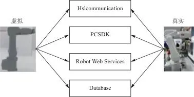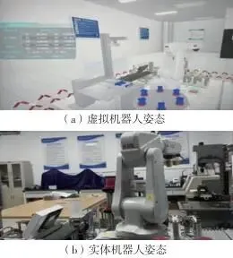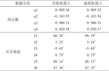图8虚实机器人位姿对比通过图8可以看出,虚拟机器人与实体机器人所处位置几乎相同,手动操作示教器时,虚拟机器人可以同步实体机器人实时运行,对比表2的虚实交互数据发现,虚体与实体之间还存在着微小差距,试验结果表明本文所设计系统基本可以达到虚实同步的要求。 表2虚实交互数据验证