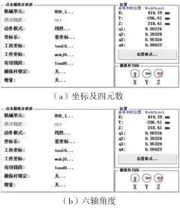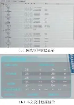 图6机器人示教器数据显示这些数据是用户了解机器人运行状态的关键数据,为实现设备运行过程动态展示数据的可视化场景,根据需求进行数据显示界面设计。数据框要求简洁明了,所需数据清楚地显示于表格中;数据框要调整为半透明状态,使可视化场景有更好的观感。应用Unity中的UGUI组件,将上述采集到的机器人数据以Text形式对应显示于所设计的界面中,使数据在可视化场景中实时更新,设计前后的数据对比如图7所示。