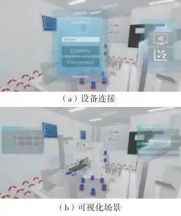 图10设备认知界面客户端获取到生产线运行多源异构数据后,在Unity3D引擎中对实时数据进行可视化场景界面开发,实现模型的实时驱动需要用到Update方法,此方法会被引擎定时调用,以更新模型状态。根据客户端接收到的实时数据,在Update方法中动态更新模型,根据机器人速度、加速度、力矩,加工中心及生产线其他信息的参数,对实时数据显示界面进行设计,通过C#脚本控制各参数数据实时更新,即实现数据的交互,使虚拟环境中的模型真实反映实体生产线的运行状态。设计状态显示面板如图11所示,输入IP地址与实体设备进行连接,实现虚实同步运行,生产线中的重要数据实时显示于界面上,有利于使用者了解设备的运行状态。