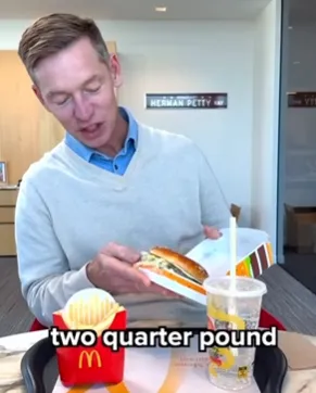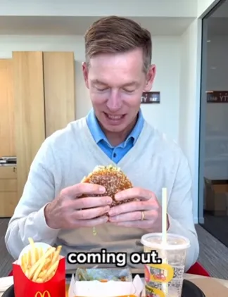 视频里,麦当劳 CEO Chris Kempczinski 亲自上阵试吃自家新品大拱门汉堡,他当然不可能说不好吃,然而视频一出来,给大家伙看无语了。