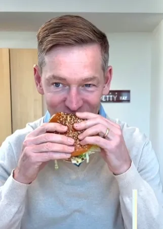 在这段尴尬的视频片段中,他先评论说自己甚至不知道该如何处理这个汉堡,并发出惊叹: