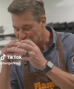 汉堡王就先发制人,派出北美区总裁 Tom Curtis 拍视频,只见他穿着围裙,背后是厨房,大口咬下自家招牌汉堡,酱汁直接吃脸上,还不忘补了一句:“唯一缺的就是一张餐巾纸”。