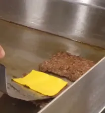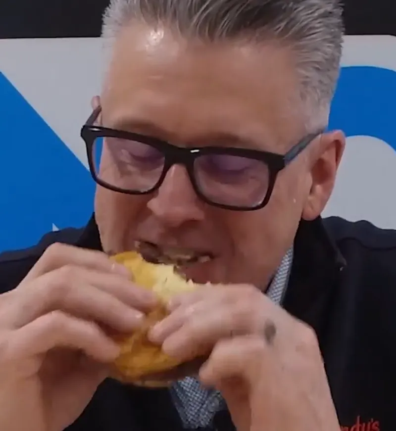 另一边,Wendy’s 的美国区总裁 Pete Suerken 更是连做带吃,亲自下厨在烤架上现做了一份培根汉堡,边做边吃,强调自己汉堡“很新鲜,从不冷冻”。