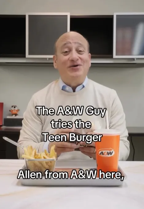 加拿大这边的本土选手 A&W 也让代言人 Allen Lulu 毫不掩饰穿了一件和麦当劳 CEO 差不多的衬衫,手持自家的 Teen Burger,一本正经对镜头说:“我们喜欢这款产品。虽然大多数人称之为汉堡。我甚至不知道该怎么享用它。”