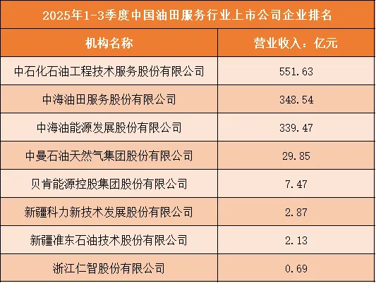 一、2025年1-3季度中国油田服务行业上市公司企业排名分析