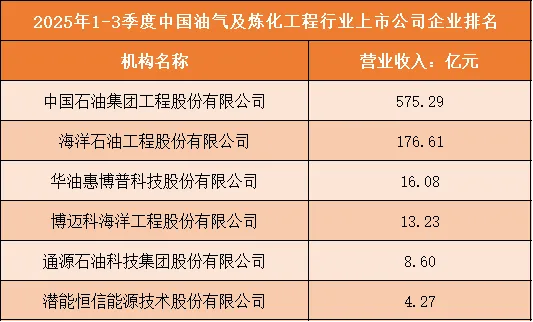 一、2025年1-3季度中国油气及炼化工程行业上市公司企业排名分析