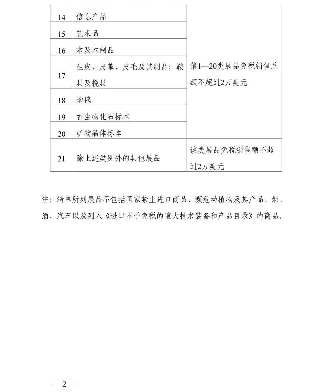 二、享受税收优惠政策的展品不包括国家禁止进口商品、濒危动植物及其产品、烟、酒、汽车以及列入《进口不予免税的重大技术装备和产品目录》的商品。