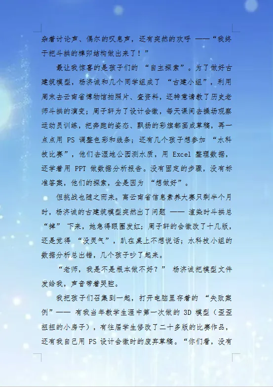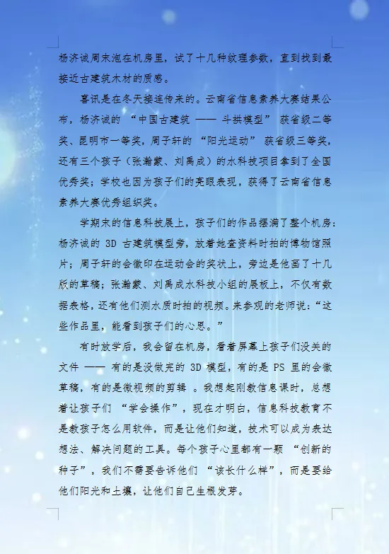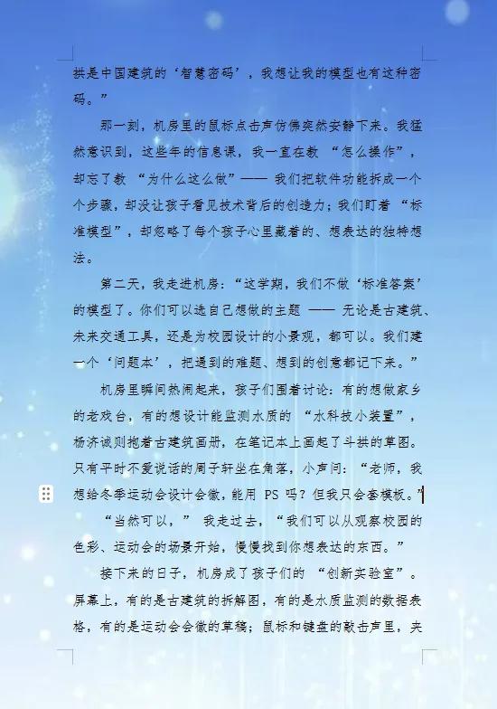 在数字技术的空间里,当学生说出“我想做带斗拱的古建筑”时,杨黎老师猛然意识到自己只教“怎么操作”,却忘了问“为什么这么做?”他打破桎梏,让孩子们自主探索。当困难接踵而至,杨老师没有给出标准答案,而是打开自己的失败案例:“没有谁的创新是一次成功的。”最终,那个孩子的古建筑模型获省级二等奖,会徽印在了运动会奖状上。但比奖状更珍贵的,是孩子们眼里亮起的光——那是被点亮的创新种子。