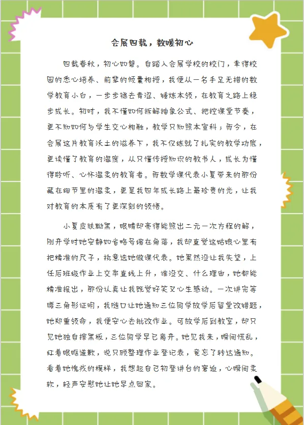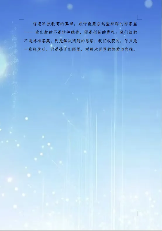 回望三位老师走过的路,忽然发现,他们的故事里藏着同一个秘密:张妙忆老师在小夏的道歉里,读懂了小数点后的重量;夏海娅老师在孩子们红肿的眼眸中,看见了温柔的回响;杨黎老师在键盘上亮起的光里,等到了创新的种子破土而出。原来,教育从来不是单向的给予,而是一场光与光的相遇——我们在照亮孩子的同时,也被孩子深深照亮。