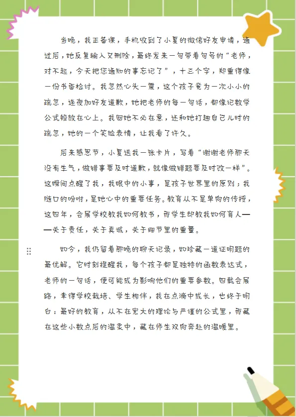 在数学的逻辑世界里,张妙忆老师始终记得那个叫小夏的女孩。那个傍晚,小夏因忘记转达通知而红着眼眶道歉,当晚发来微信:“老师,对不起,今天把您通知的事忘记了。”后来感恩节,张老师读到她的卡片:“谢谢老师那天没有生气,做错事要及时道歉,就像做错题要及时改一样。”那一刻张老师恍然——自己眼中的小事,是孩子世界里的原则。每个孩子都是独特的函数表达式,老师的一句话,便可能成为影响他们一生的参数。