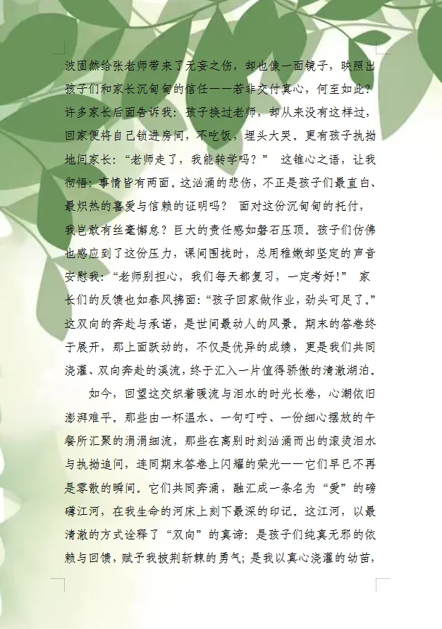 在班级的方寸天地里,夏海娅老师带着忐忑踏入会展,是四十六双眼睛给了她勇气。孩子们的回响如涓涓细流:咽喉灼痛时递上的温水,重感冒时踉跄端回的水杯。直到休产假的老师即将归来,孩子们红肿着眼圈哭喊:“老师,您是不是不带我们了?”有家长说,孩子回家锁上房门,埋头大哭:“老师走了,我能转学吗?”那汹涌的不舍,是最炽热的信赖。期末答卷上跃动的不仅是成绩,更是他们共同浇灌的双向溪流。