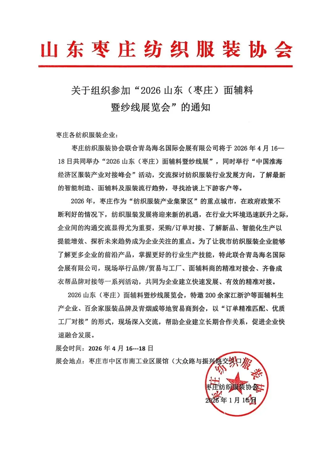 “2026山东(枣庄)国际纺织服装供应链博览会暨中国淮海经济区服装产业对接峰会”将于4月16-18日在枣庄盛大举办,导航地址枣庄市市南工业区!展会以促进产业交流、推动行业发展为宗旨,汇聚了面辅料纱线、服装贴牌、数码印花、智能制造等领域的优质企业,展示前沿产品与技术!展览面积达5000㎡,参展企业200+家,本届展会聚焦于精准对接供需双方,旨在促进现场交易成果。面辅料纱线 | 服装服饰 | 数码印花 | 智能制造