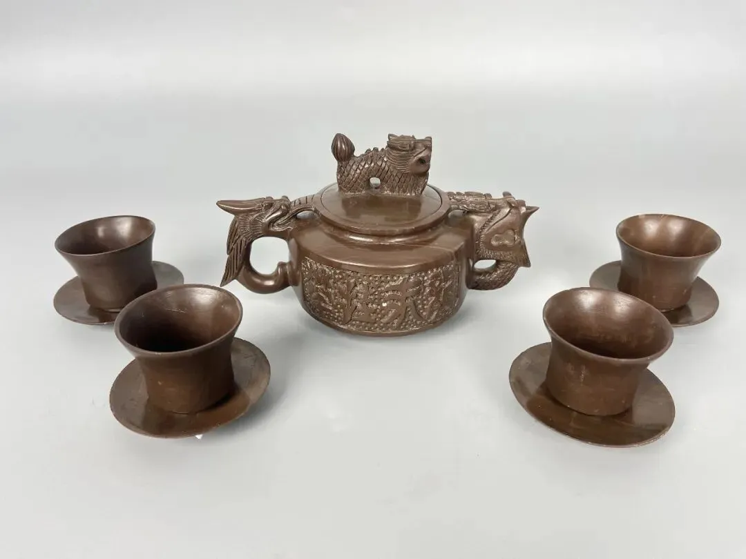 大清双龙原石刻茶具一套(九件)