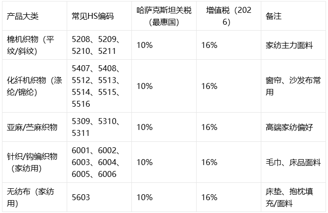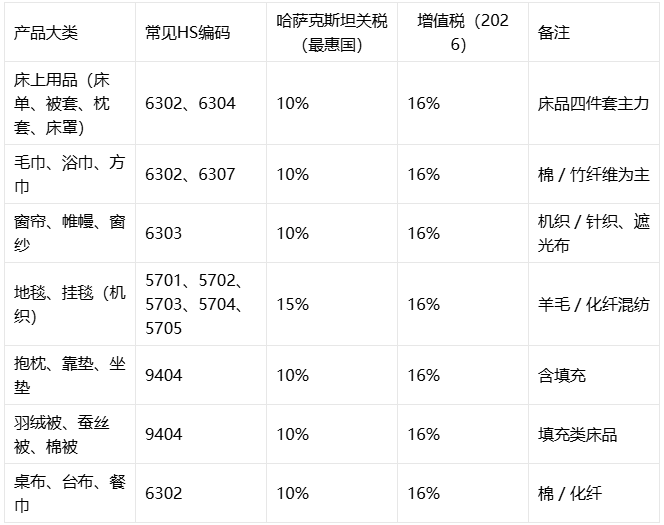 中国家纺出口哈萨克斯坦的产品清单与 HS 编码、关税