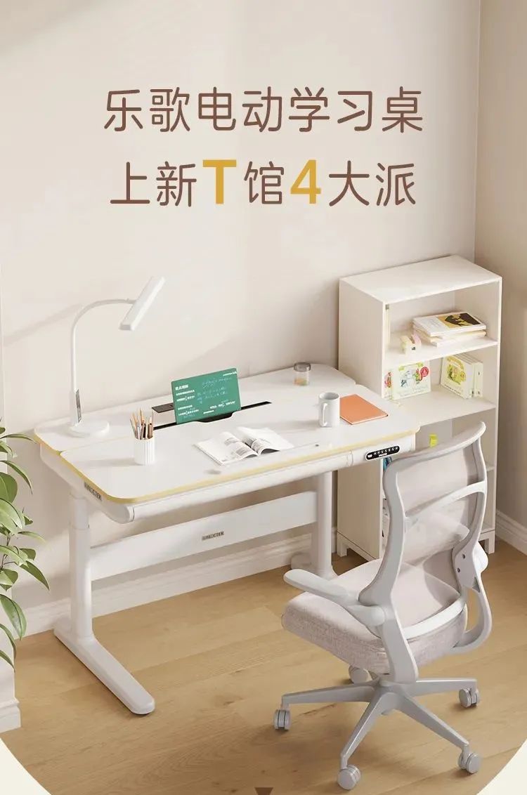 乐歌电动学习桌T4不仅囊括“四大派”所有本领,更是挺进颜值派与经济派,全方位满足家庭需求,简约大方的设计让它成为家中一道靓丽的风景线,高性价比让每个孩子都能享受到优质的学习环境。健康派学习桌,注重人体工学设计,关爱孩子健康成长;实用派学习桌,功能齐全,一桌多用;科技派学习桌,融合智能科技,引领未来学习趋势;环保派学习桌,绿色环保,致力推动可持续发展。