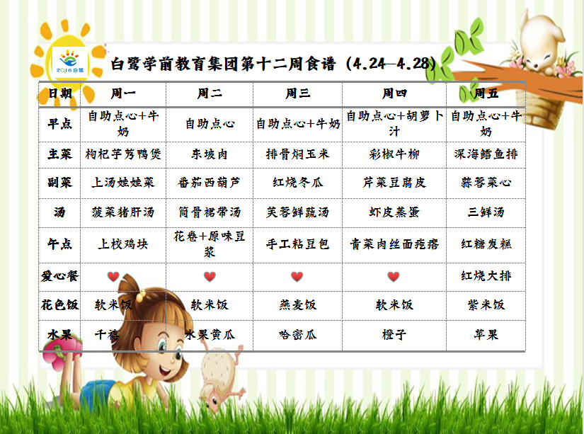 【白鹭·保健】美好“食”光|白鹭学前教育集团第十二周食谱4.24-4.28
