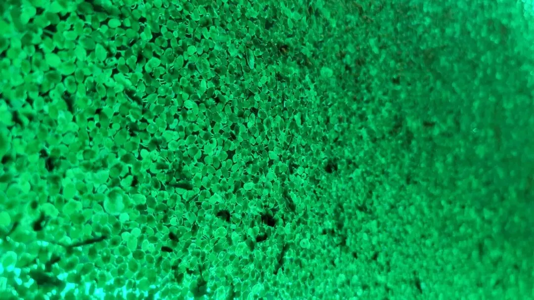 《说⽂解字》有⾔:“苹也,⽔草也”。如果说这是字源,那么在王墨⽯的“光合”项⽬中,浮萍则成为他对于阈限认知的可视化之物。它悬浮于⽔陆之间,⽔⾯作为天,空⽓作为⽔;亦流动于可⻅与不可⻅之间,它不归属于任何地理位置,却⼜以不可忽视之姿呈现于展区,进⼊观者视觉;它还在微观⽣命与宇宙能量之间徘徊,多样的绿⾊就像⼈们对距离⾃⼰远近不同的恒星的观测。