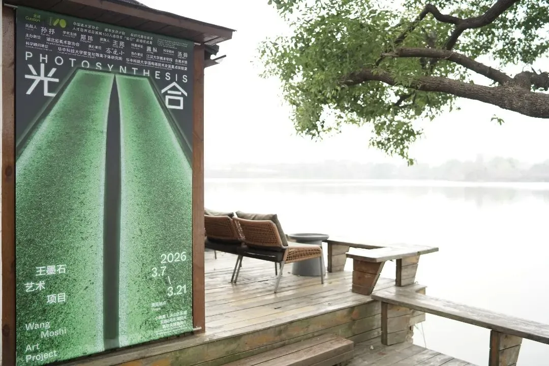 ⼜如其同名作品《光合》,王墨⽯利⽤叶绿素印相,将承载着浩渺宇宙信息、源⾃恒星内部核聚变或⾼能物理事件的宇宙中极为微⼩的中粒⼦,通过阳光照射,基于叶绿素对光的敏感反应,直接印在⼩⿅斋及后⼭采集的叶⽚上,以薄如纸⽚的叶⾯接收阳光。此时,王墨⽯的媒介实验促成了⼀场可视化的,源于微观秩序与宇宙能量的光谱叙事。⽽“光合”也不再只是⼀种基于叶绿素的⾃然反应模式,⽽是从⽣物⾏为中脱离,转为⼀种被技术中介化的,在科学与社会、⾃然与技术、艺术家与观者之间重建感知的能量转译策略。
