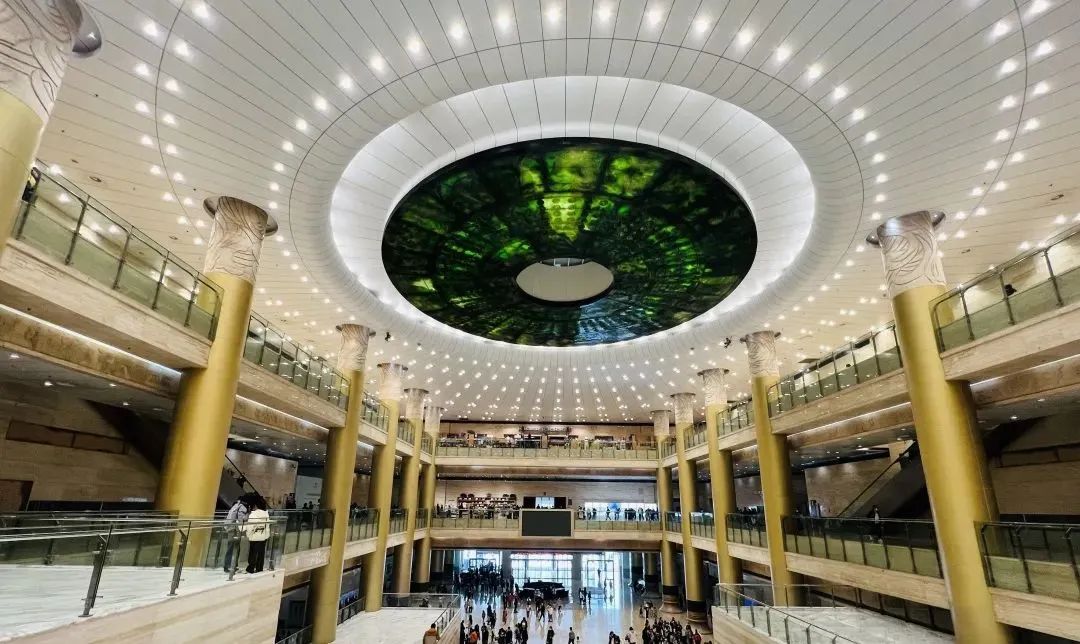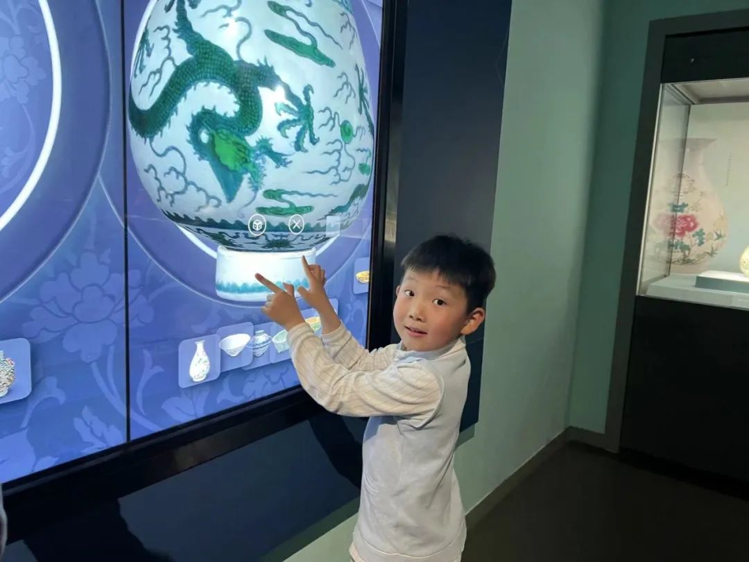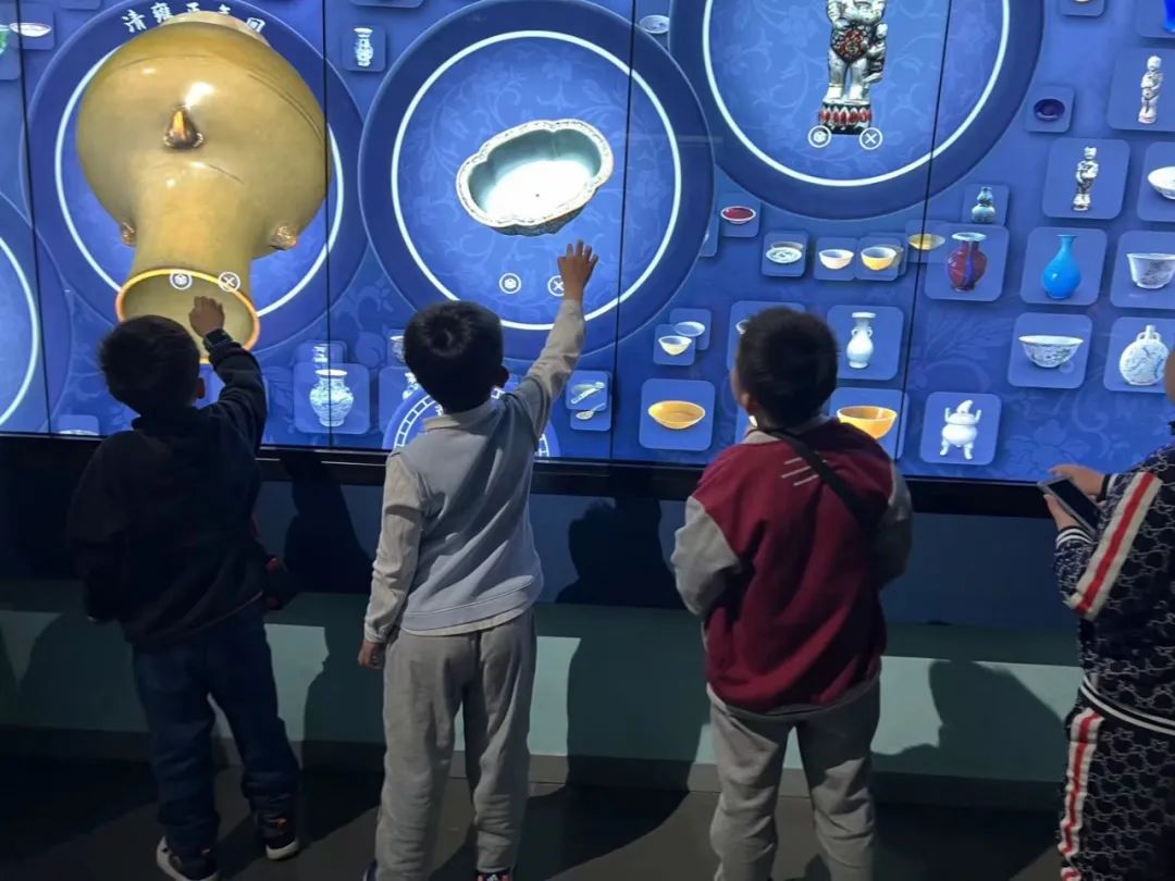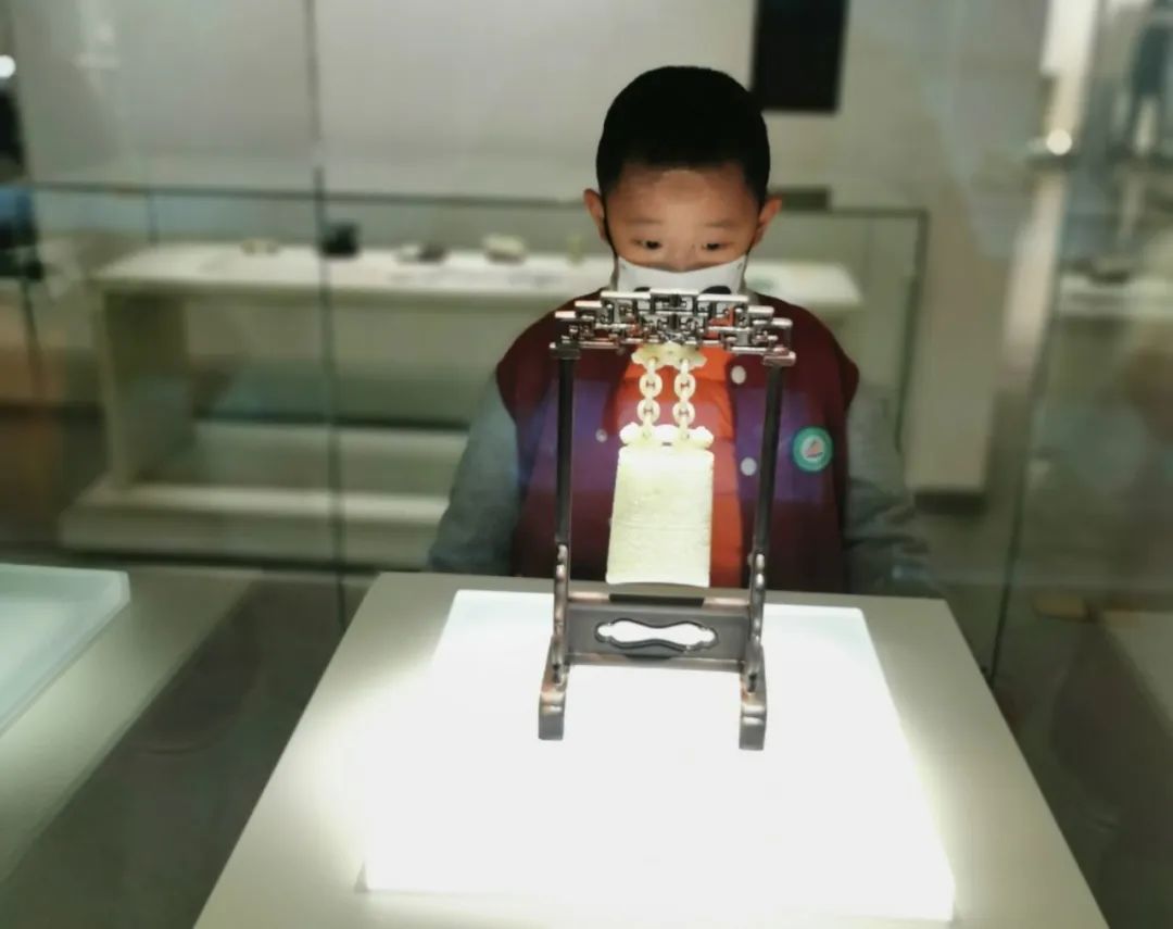按照约定时间孩子们来到了博物馆,首先在门口拍了集体照。接着大家怀着激动与好奇的心情踏入博物馆内宏伟的大厅。眼前的宏伟建筑,气势磅礴,浑厚凝重的建筑风格,雪花青石材的色调显得它无比典雅,粗犷有力,韵味十足。独特的穹顶设计,一块镶嵌着碧绿玉璧的天顶配合着周边的灯光,显得富丽堂皇不失肃穆庄重。