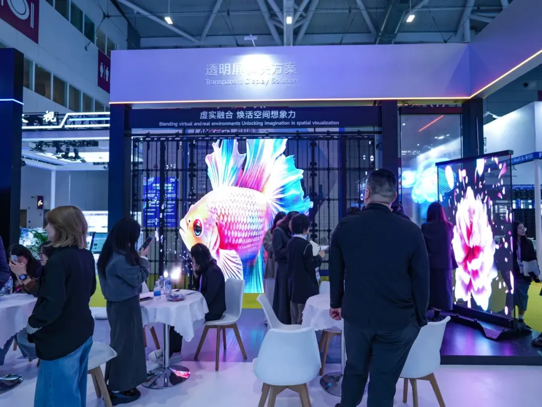 在新型显示领域,谷亚展示了透明的 晶膜屏 与 全息屏。晶膜屏厚度仅3mm,透光率达85%-90%,并可实现弯曲贴合;全息屏同样保持超薄特性,具备高亮度和高对比度,适用于商业空间打造沉浸式视觉体验。