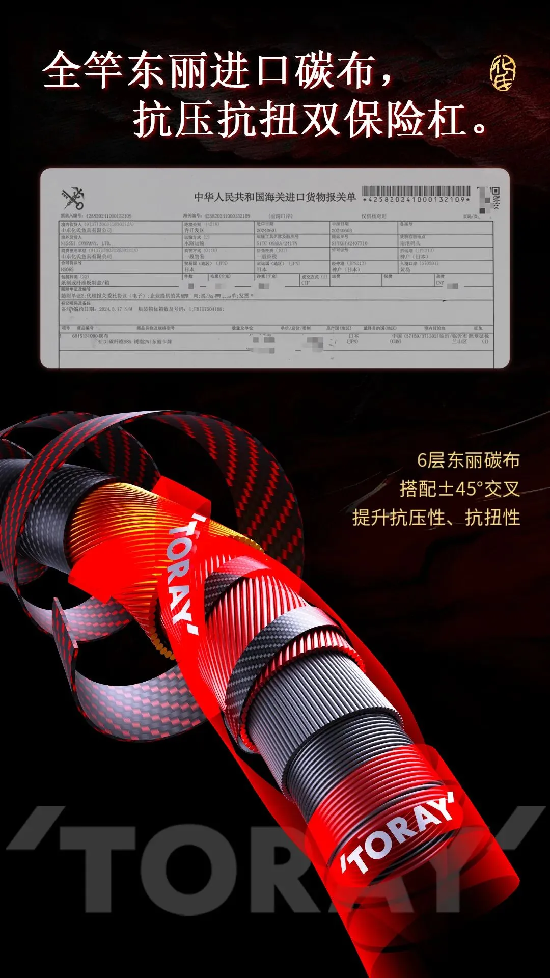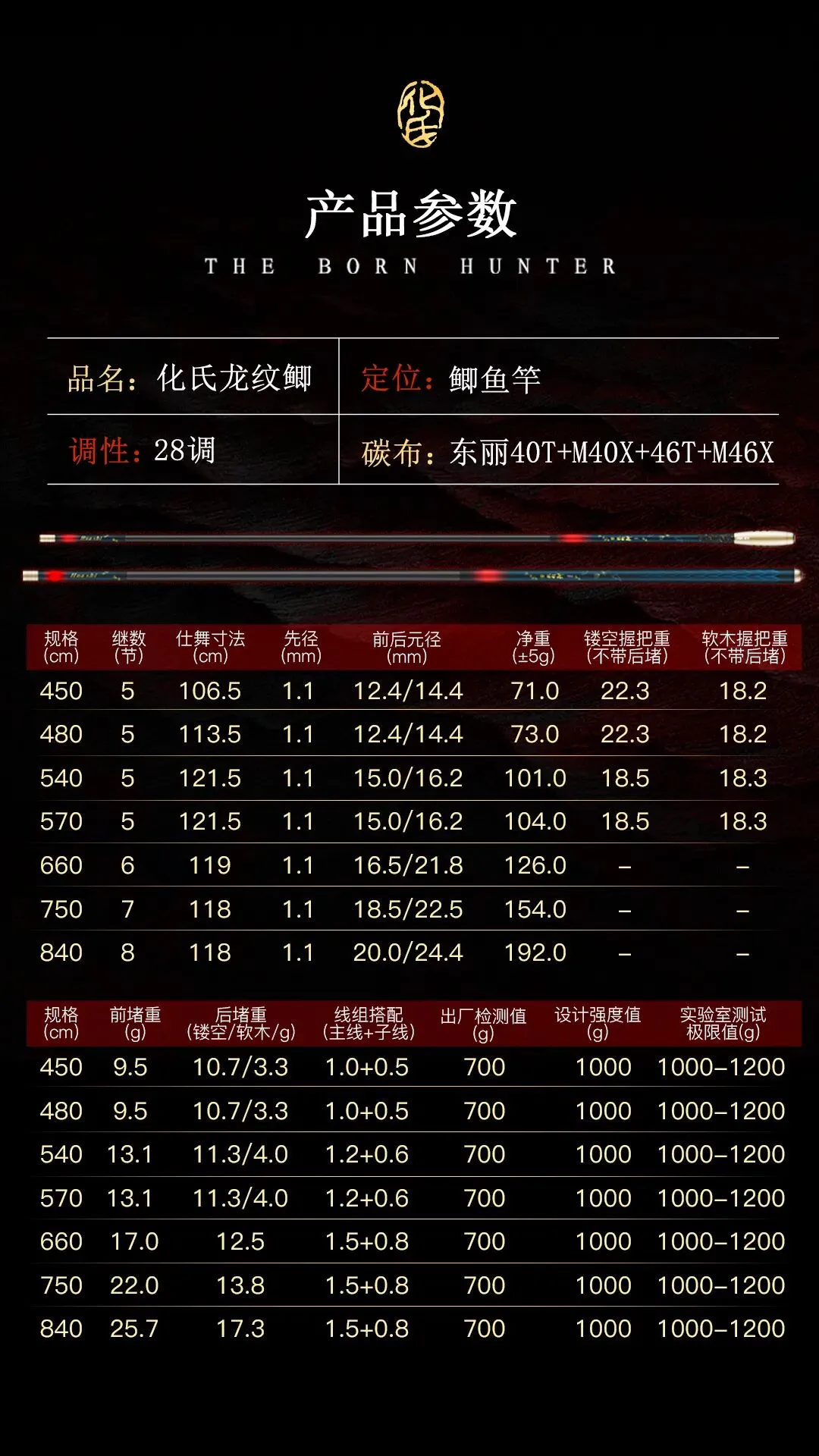 龙纹鲫主布选用东丽40T+M40X+46T+M46X碳布,搭配6层东丽碳布±45°交叉卷制工艺。竿身抗压、抗扭性能均衡,受力均匀,垂钓时能呈现稳定的化氏大弯弓曲线,出厂检测值700g,实验室测试极限值1000-1200g。