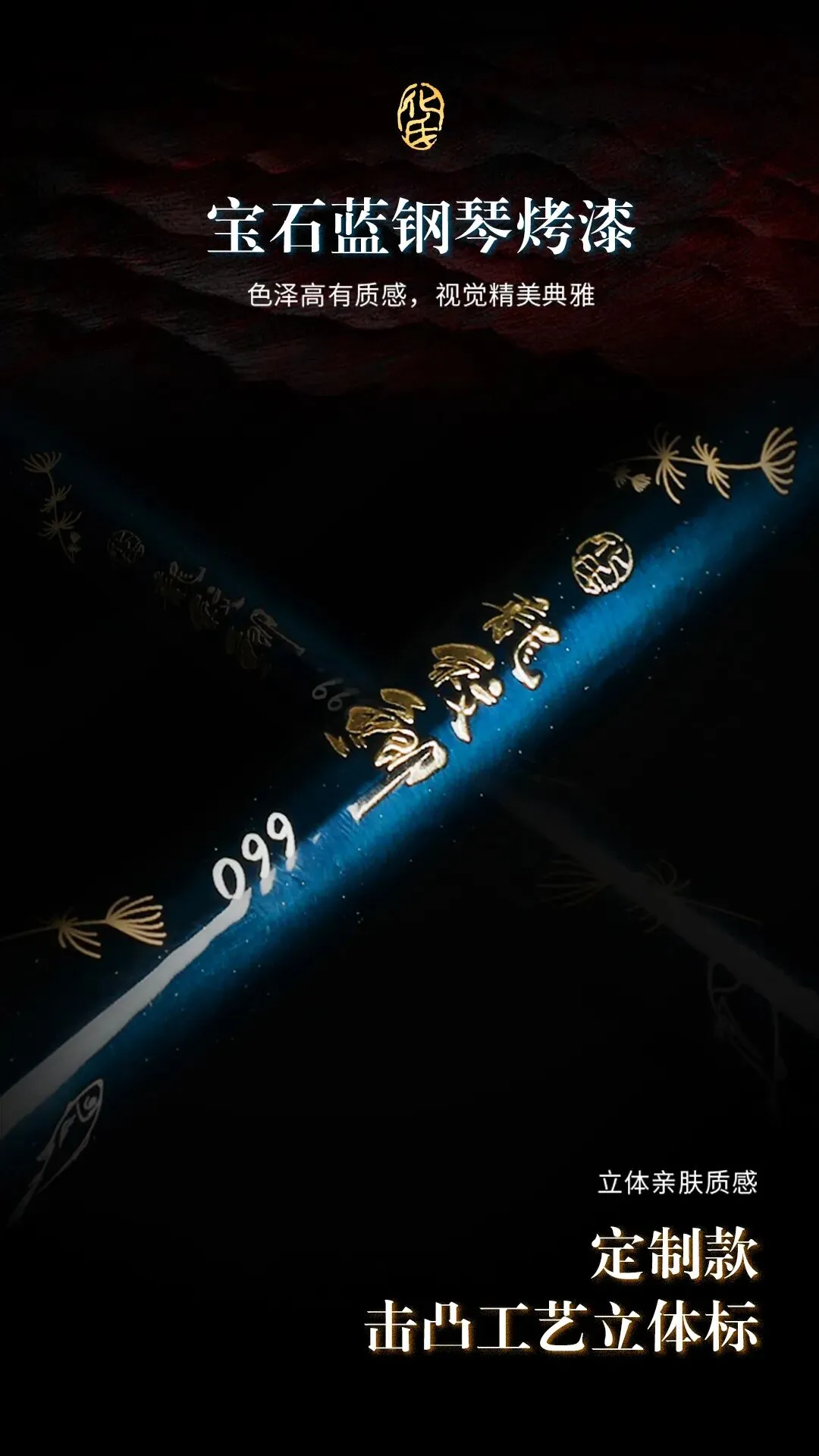 竿身采用宝石蓝钢琴烤漆,搭配中国红渐变装饰;450-570尺寸的手作泼墨纹理为手工制作,独具特色;竿身配有定制击凸工艺立体标,触感亲肤立体。