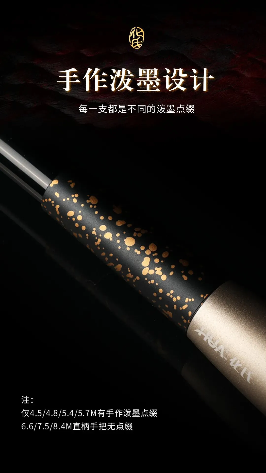 • 450、480、540、570尺寸:搭配镂空/软木双握把,竿身带有手作泼墨装饰,每支竿的纹理均不相同;