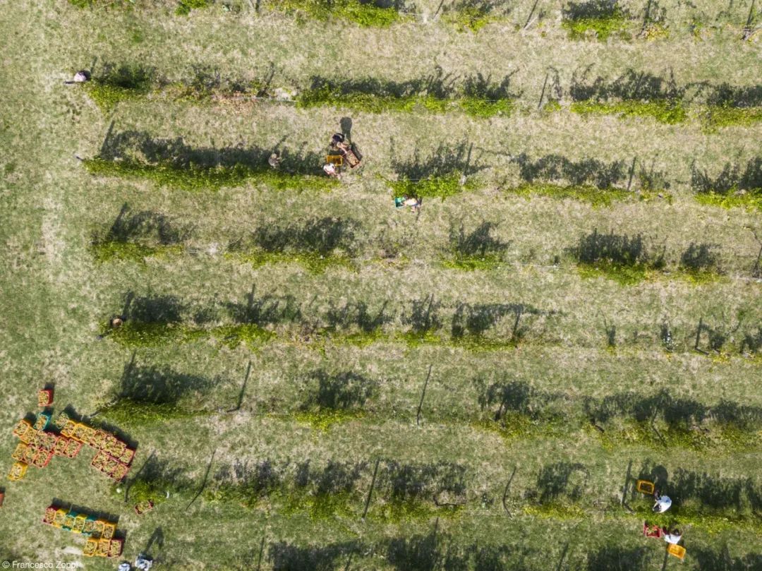 A zenith view during harvest at the Antonio Aldini vineyard