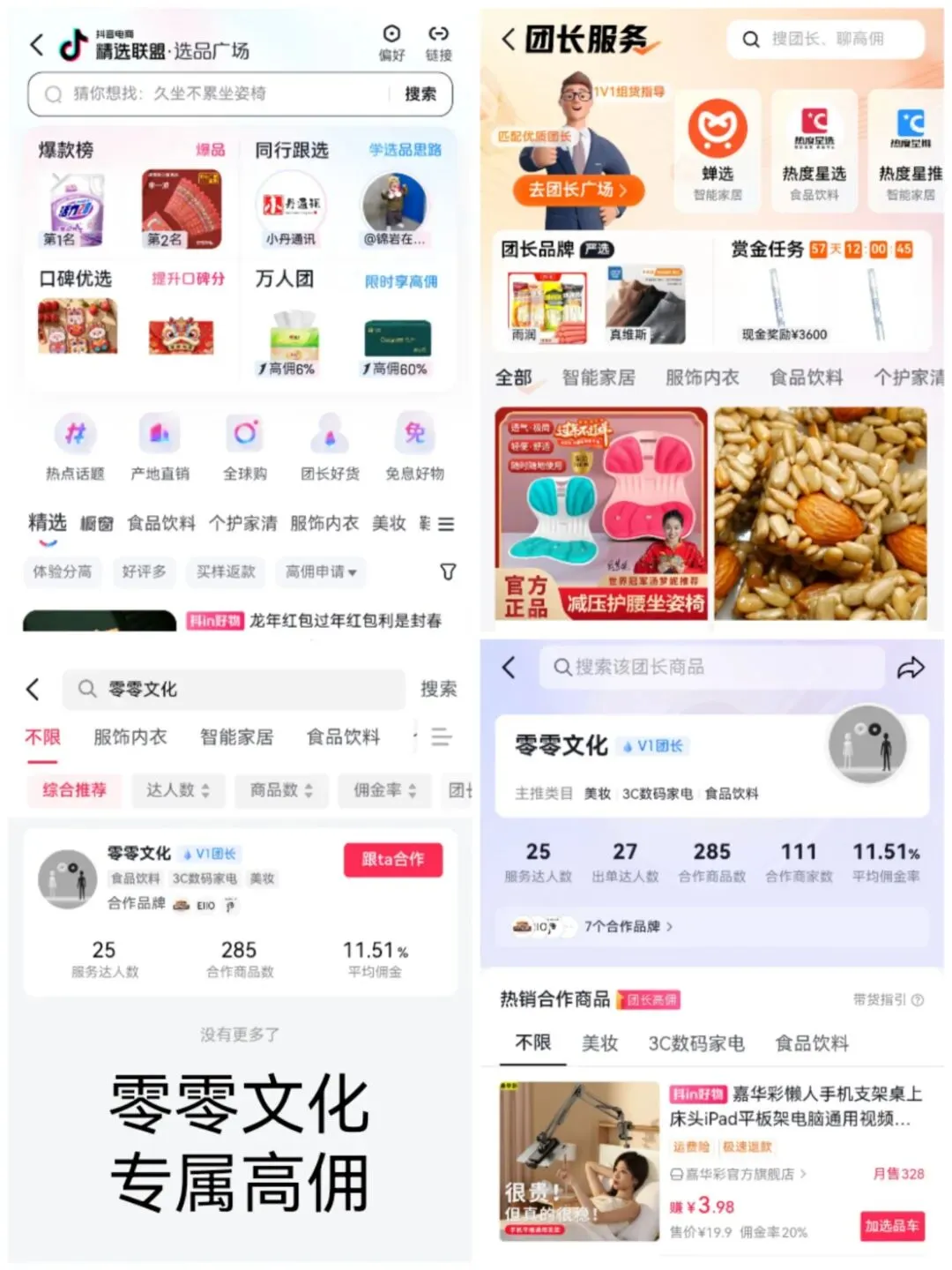 零零文化团长已上架50万+高佣爆品,合作数万品牌商家和数千达人,为他们提供多快好省的一站式选品/寄样/短视频/直播等内容电商服务。