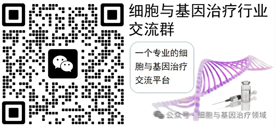 为促进细胞与基因治疗业内的合作和技术交流,媒体平台微信公众号“细胞与基因治疗领域”团队组建了细胞与基因治疗交流群。长按下方二维码,添加小编微信进群。由于申请人数较多,添加微信时请备注:院校/企事业单位名称—专业/职务—姓名。如果您是PI/ 教授/主管及以上职务,还请注明。