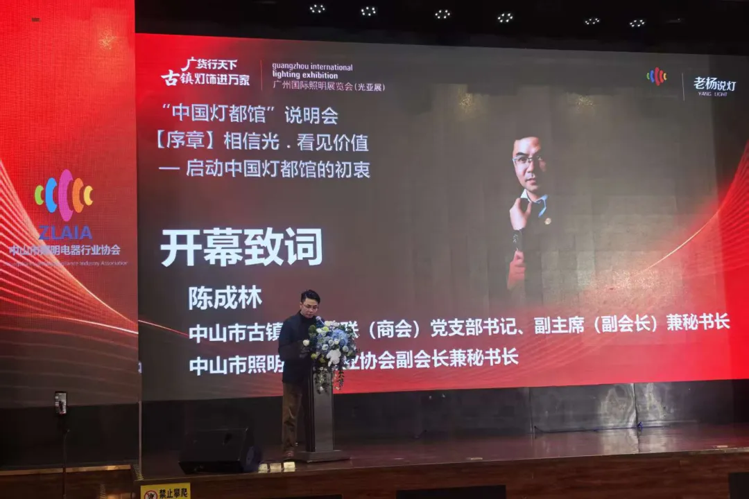 3月6日,2026广州国际照明展览会“中国灯都馆”说明会在中山市古镇镇隆重召开。次次说明会以 “ 相信光·看见价值 ” 为主题,旨在贯彻落实省、市高质量发展大会精神,推动中山照明灯饰产业集群向全球价值链高端迈进。会议由中山市商务局、古镇镇人民政府指导,中山市照明电器行业协会、中山市老杨说灯信息咨询有限公司主办。市、镇领导、嘉宾与行业专家、企业代表约300人齐聚一堂,共话高质量发展新路径。