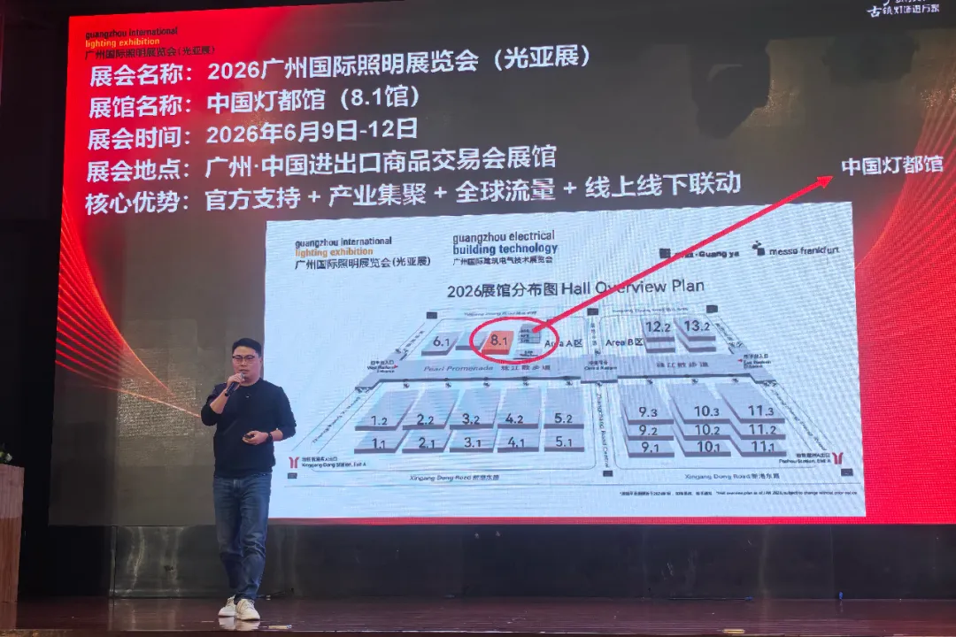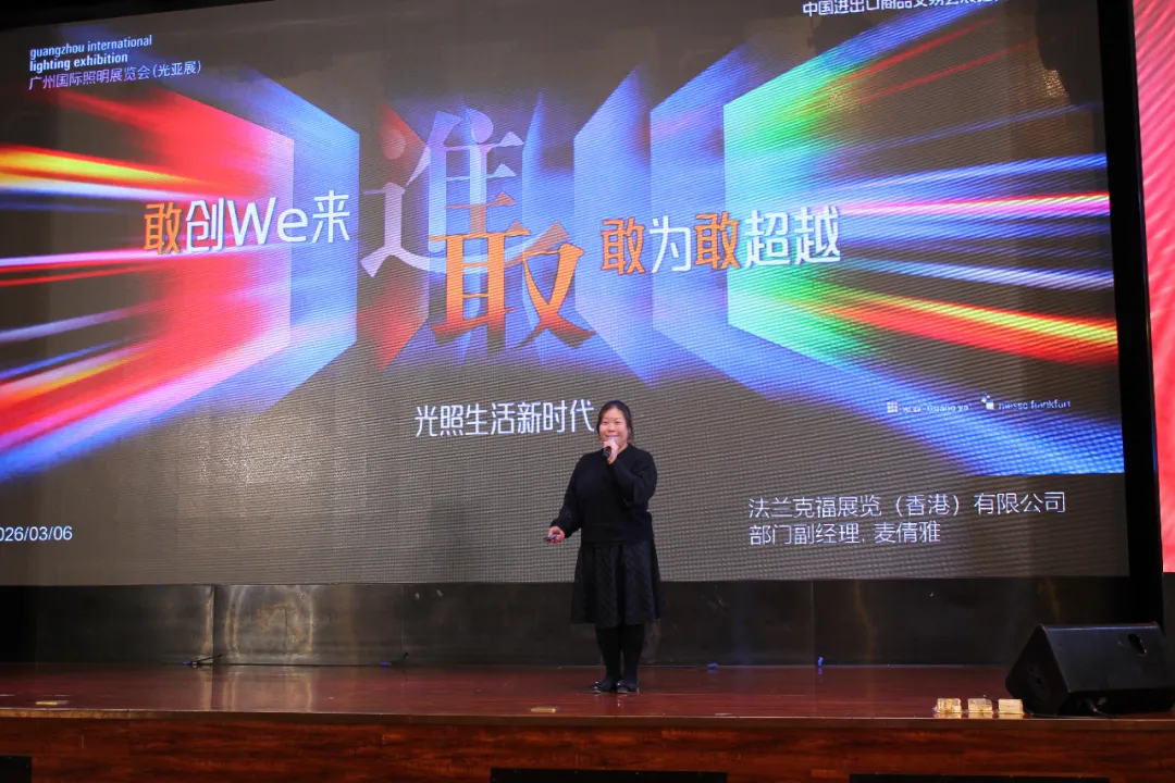 在核心发布与分享环节,广州国际照明展览会负责人详细解读了2026年展会的全新主题及“中国灯都馆”的“力量矩阵”布局。她表示,展会将通过精准的展区规划与全球买家邀约,助力灯都企业精准对接国内外订单。