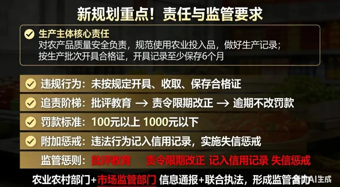 核心是把合规做在监管前面。严格落实生产记录留存制度,农产品生产端按批次开具承诺达标合格证,生产记录至少保存6个月;主动规范农兽药、添加剂使用,杜绝禁用物质使用、常规物质超标问题;建立全链条追溯体系,实现产品来源可查、去向可追,从源头规避合规风险。