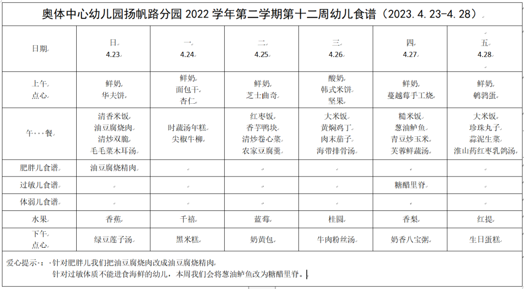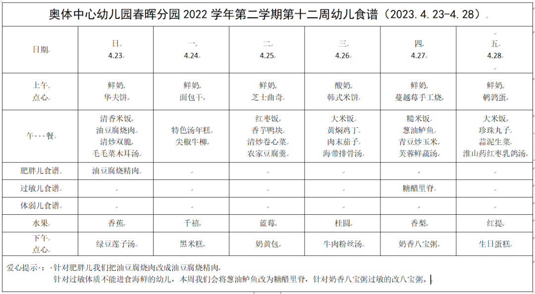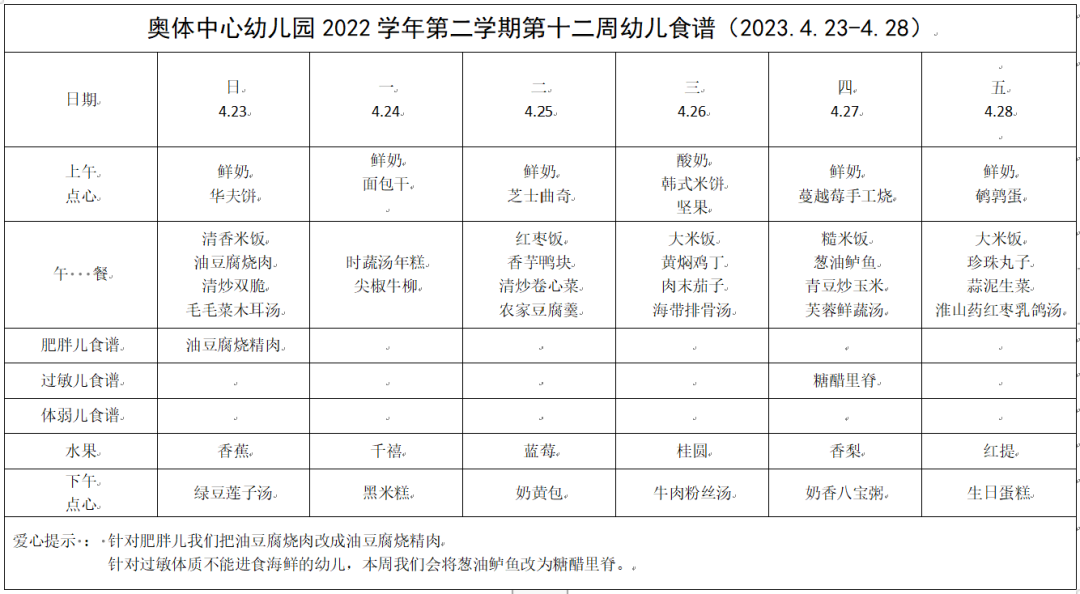 奥体中心学前教育集团遵循科学的幼儿营养结构,给幼儿营造饮食与健康教育为一体的就餐氛围,将幼儿就餐习惯、养成教育、饮食文化融入日常。同时在食谱制定上,针对体重超标儿、过敏儿、体弱儿等幼儿在个别菜品上实行个性化照顾餐,只为让孩子们吃得健康、吃得营养。