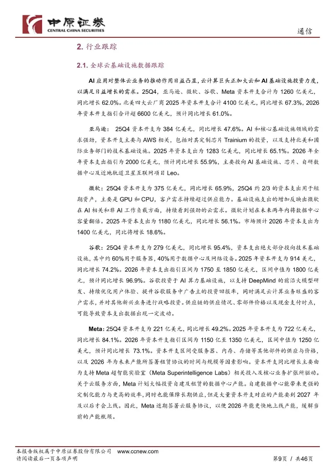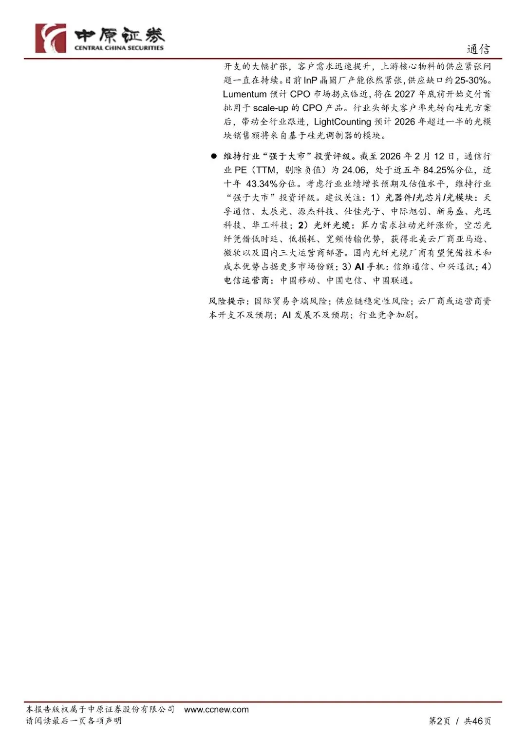 通信行业月报:北美云厂商资本开支强劲,CPO商业化应用拐点临近-260213-中原证券-46页