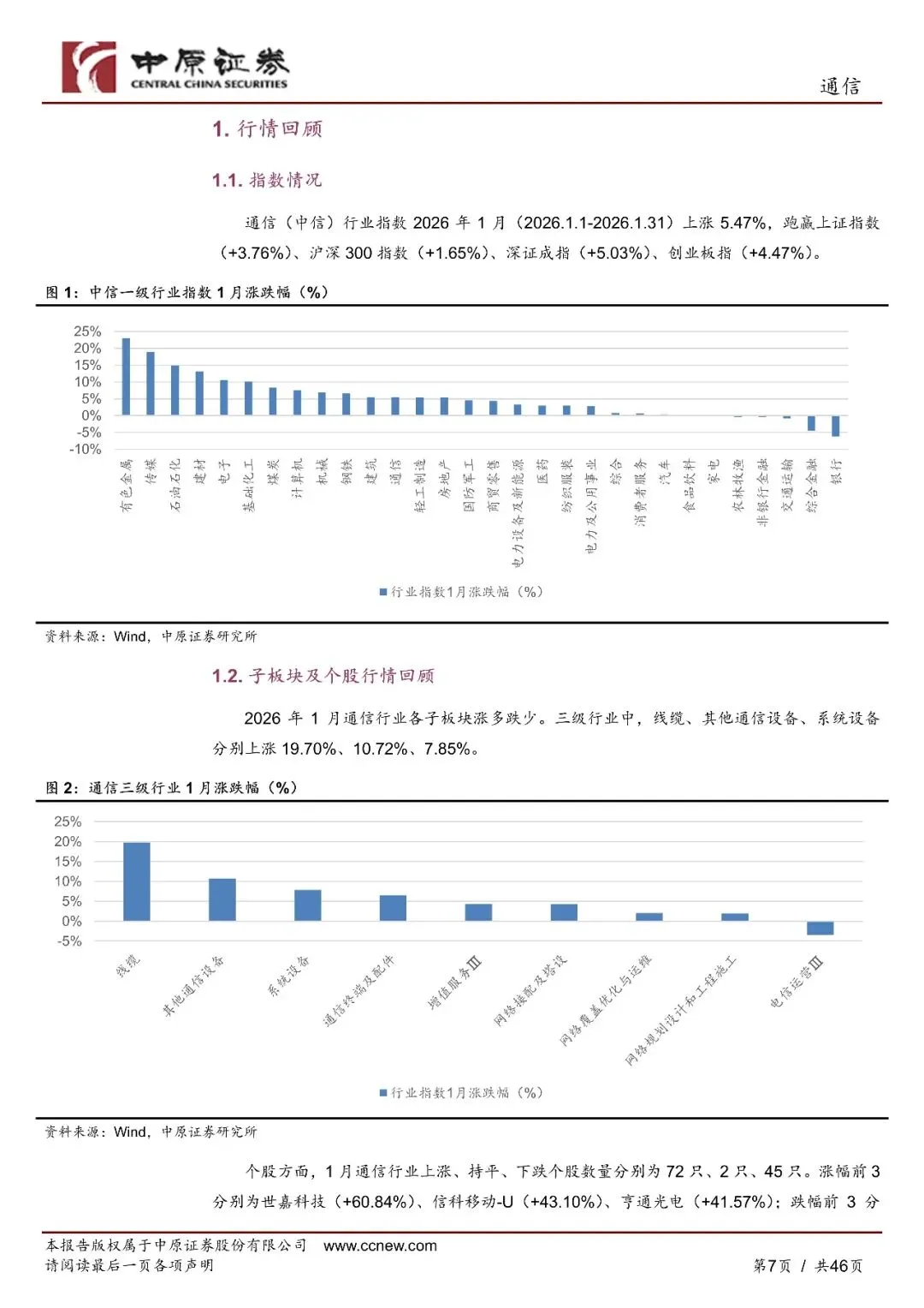 2026 年 1 月,通信行业指数强于沪深 300 指数。通信行业指数 1月上涨 5.47%,跑赢上证指数(+3.76%)、沪深 300 指数(+1.65%)、深证成指(+5.03%)、创业板指(+4.47%)。