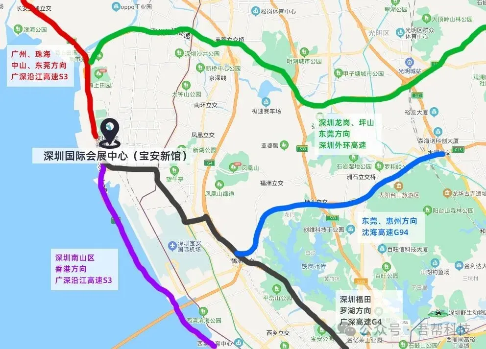 深圳站(罗湖):乘地铁1号线(机场东方向)到车公庙→换乘地铁11号线(碧头方向)到机场北→换乘地铁20号线直达展馆(国展站C出口)